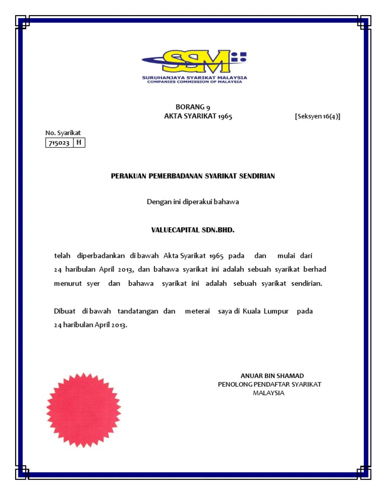 Motor Syarikat dan Latihan akan disediakan. Borang 9 Akta Syarikat 1965 - Perakuan Pemerbadanan Syarikat Sendirian Borang 8 Akta Syarikat 1965 - Perakuan Pemerbadanan Syarikat Awam Borang 49 Akta Syarikat 1965 Borang 13 - Jika ada pertukaran nama syarikat Perakuan Pemerbadanan Atas Pertukaran. The solution eliminates all manual and time consuming processes with an integrated and online process.